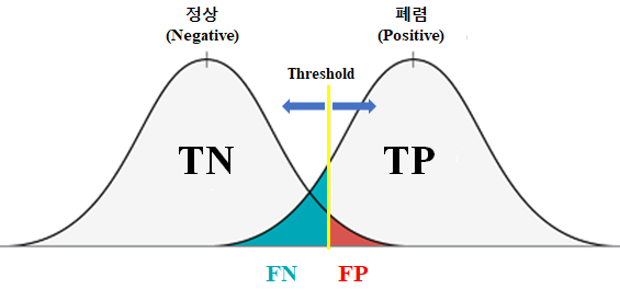 위의 그래프를 "폐렴 진단 모델"에 대한 혼돈 행렬의 TN, TP, FN, FP로 표현해보면 아래와 같습니다.