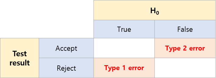 가설 검정 표를 혼돈 행렬과 같이 비교해본다면, 다음과 같을 것입니다.