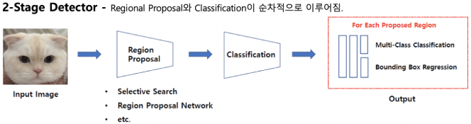 2-stage detector는 Regional Proposal과 Classification 을 순차적으로 진행하여 객체 검출을 하는 방식입니다.