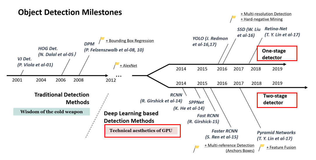 위 그림은 객체 검출 문제를 해결한 모델들을 잘 나타내주고 있습니다. 1-stage 방식에는 대표적으로 YOLO, Retina-Net 등이 있으며, 2-stage 방식에는 RCNN 시리즈와, SPPNet 등이 있고, 이외에도 수많은 모델이 존재합니다.