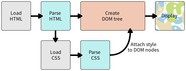우리가 보고 있는 HTML은 "브라우저" 가 HTML 문서를 로드하여 표시하게 됩니다. 이때, 문서의 콘텐츠와 해당 스타일 정보를 결합해서 표시해야합니다. 나열된 단계에 따라, 브라우저가 HTML, CSS를 로드하여 사용자에게 표시되는 과정을 단순화한 단계입니다.
